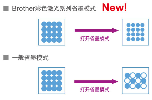 選擇Brother省墨模式可以節(jié)省墨粉消耗。兄弟彩色激光系列省墨模式是通過縮小墨點空間來完成的,墨點的數(shù)量沒有改變,即使使用了省墨模式也不會影響打印質(zhì)量。